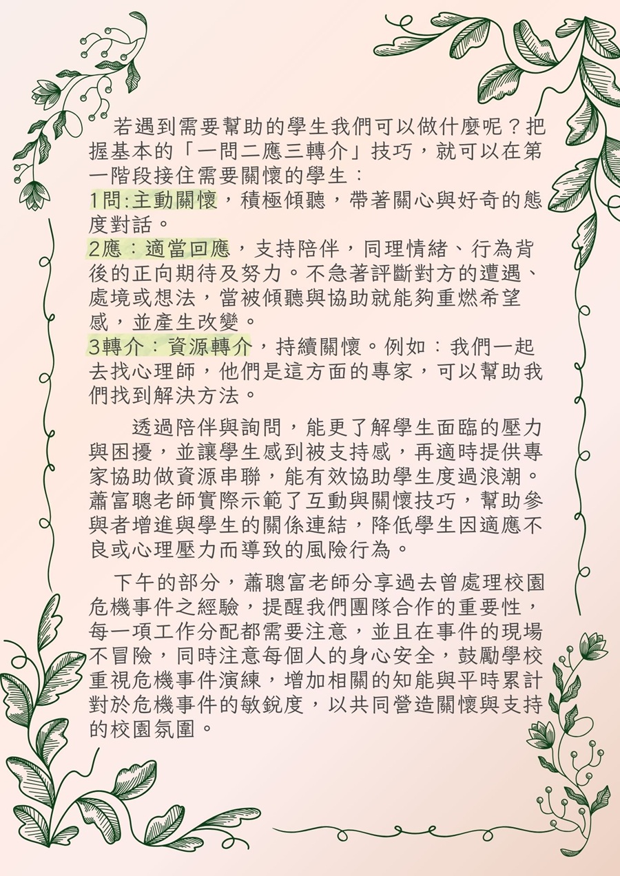 全員輔導,扶學生不倒──輔導知能暨校園危機事件演練工作坊